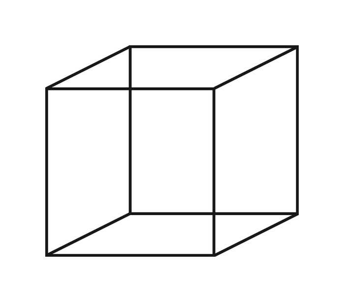 4. Ainsi le cube de Louis Albert Necker (1862) est-il perçu en trois dimensions ; il est plus simple pour le cerveau de considérer la figure de Necker comme un tout cubique en perspective axonométrique plutôt que comme 12 segments joints sur un plan à deux dimensions (ce que le dessin est en réalité). Le cube de Necker n’existe pas, il est pourtant perçu. Il est même perçu deux fois, différemment, puisqu’il fait parti de la famille des perceptions bi-stables (et réversibles), comme le canard-lapin par exemple. Si le regard se porte sur l’angle en Y de la partie haute du dessin, le cube semblera être perçu de dessus ; si la vue se concentre sur l’angle en Y de la partie basse du dessin, le cube semblera être observé de dessous. Ces deux angles sont les deux “points vitaux” de la figure, qui renferme donc deux formes possibles, concomitantes et antinomiques à la fois.