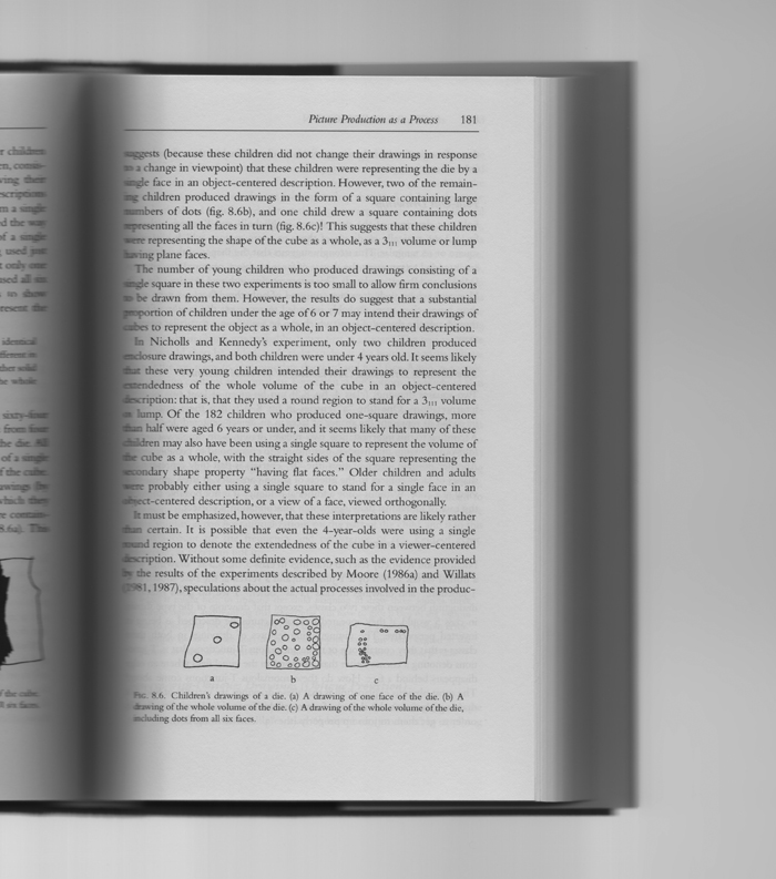 Le dessin de Willats évoque un tsumego, ces exercices de vie et de mort, véritables tests ophtalmologiques, destinés à faire progresser le joueur. Devant une situation composée, Noir ou Blanc a pour consigne de tuer ou faire vivre ; et pour y parvenir, il fabrique ou éborgne.8 Pourtant, pas d’image à résoudre ici. Il s’agit en réalité d’un dé à jouer, représenté à l’aide de trois points de vue d’observation. À l’intérieur d’un carré, un nombre indéterminé de ronds s’agglomèrent (comme pour indiquer naïvement l’impossibilité de les compter sans se tromper, par un mouvement de rotation du dé) en simulant clairement l’organisation de motifs régionalisés.