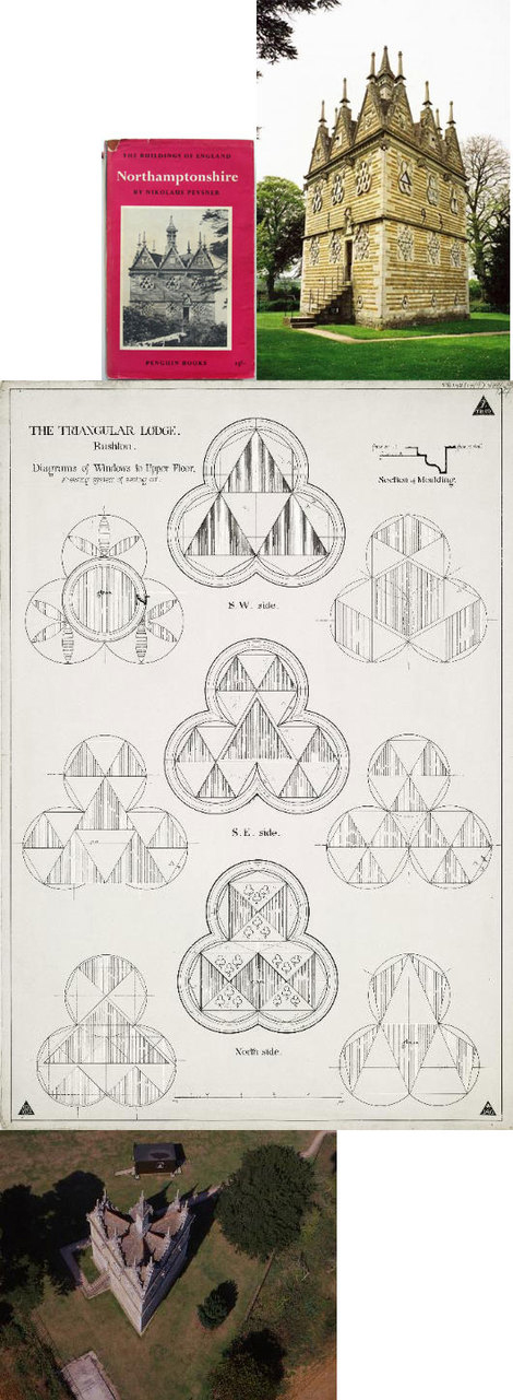 la publication de Pevsner sur l'architecture du Northamptonshire met en couverture une photographie du Triangular Lodge. Une vue des 9 fenêtres a été dessinée par J.A. Gotch en 1882 (source RIBA British Architectural Library Drawings & Archives Collection)