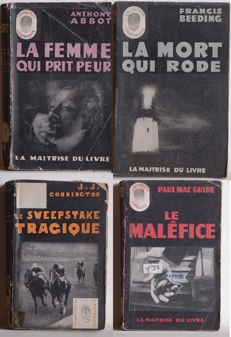 images du fantastique Alexis Orloff (merci!). De haut en bas et de droite à gauche: A. Abbot, La Femme Qui Prit Peur, La Maîtrise du Livre, Collection L'Empreinte Police (1947) F. Beeding, La Mort Qui Rôde, La Maîtrise du Livre, Collection L'Empreinte Police (1947) J.J. Connington, Le Sweepstake Tragique, NRC, Collection L'Empreinte (1935) P. McGuire, Le Maléfice, La Maîtrise du Livre, Collection L'Empreinte Police (1948)