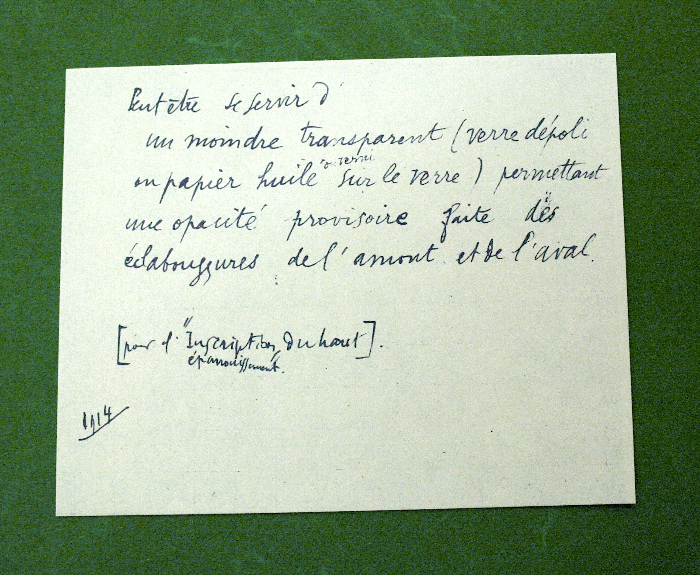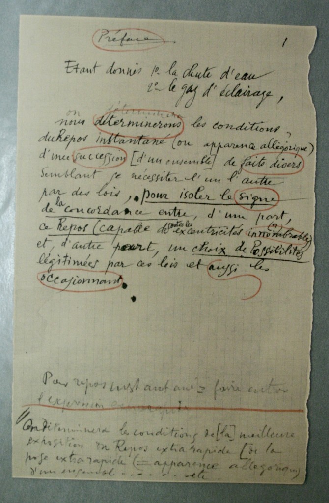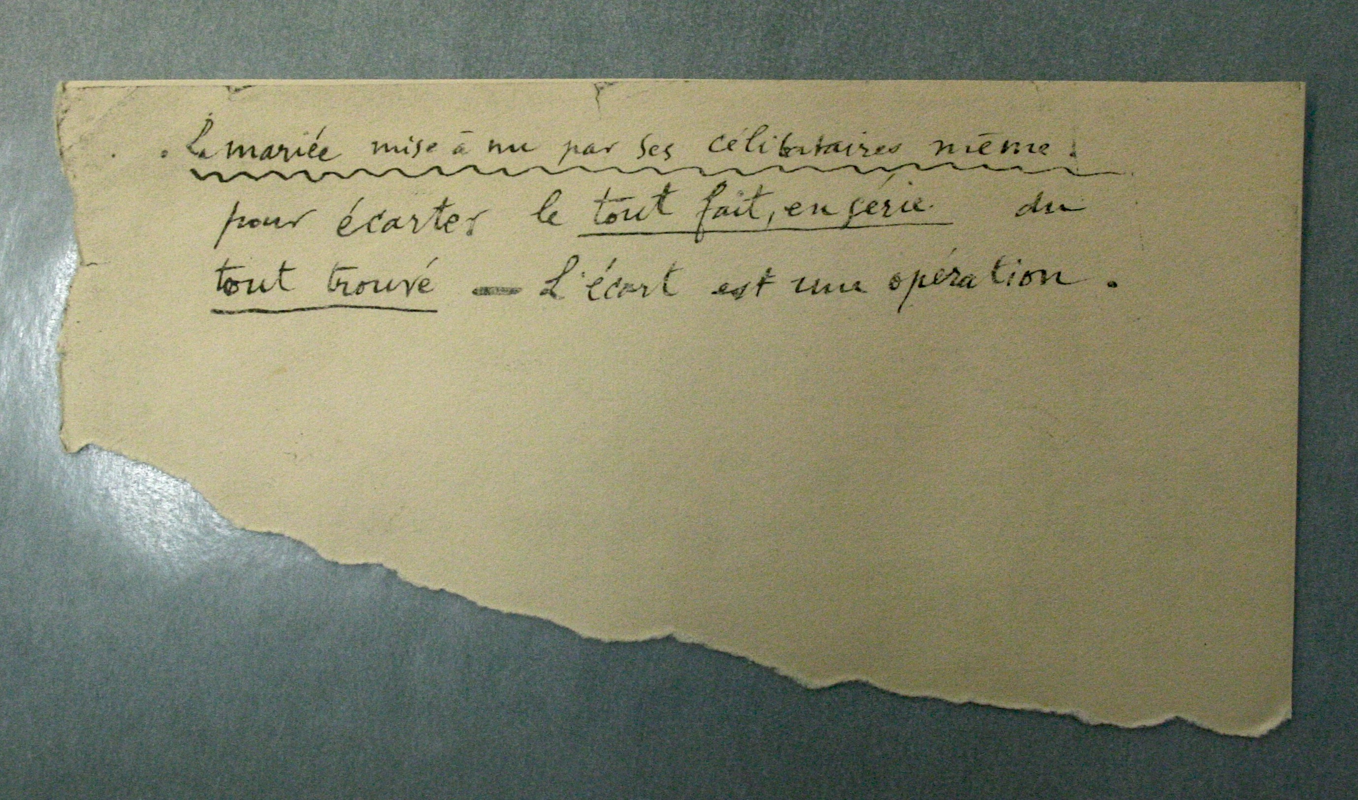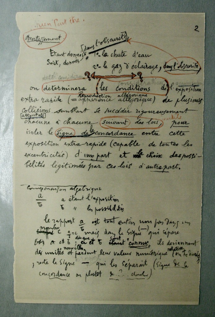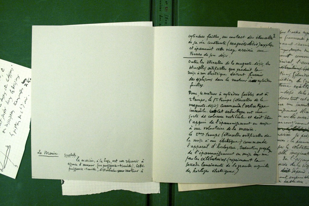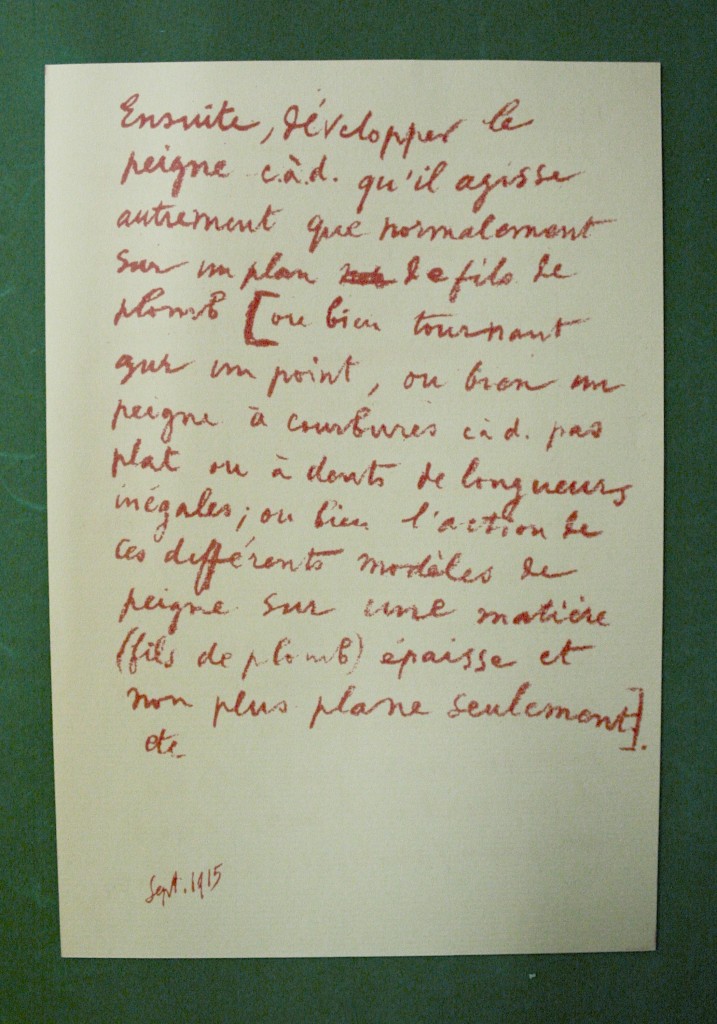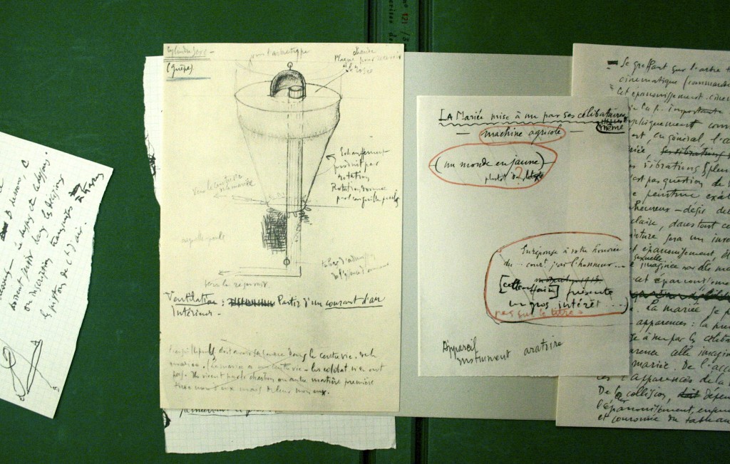 Les notes font apparaître en particulier le caractère in progressde cette œuvre conçue sur le long terme et restée volontairement inachevée tout en contenant en germe les développements d’autres travaux de Marcel Duchamp. En atteste par exemple un document dont le recto et le verso offrent deux formulations différentes d’une même note d’intention, témoignant ainsi d’une pensée en train de se construire :