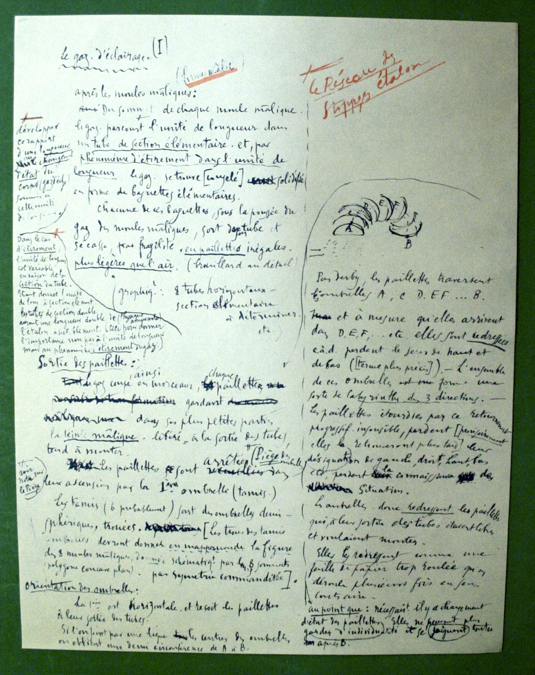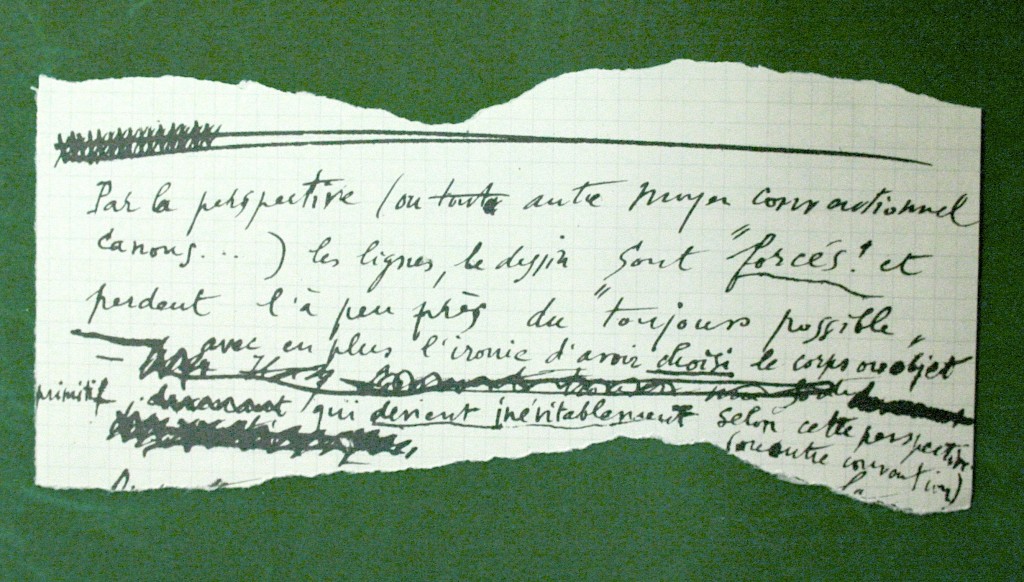 La diversité d’apparence des notes incite à ne pas seulement considérer leur sens, mais aussi à observer la façon dont ce sens s’informe, dans les ratures, par une écriture qui traduit la consignation hâtive de réflexions fugitives, à travers des dessins rapidement griffonnés, ou au contraire par des notes d’intention plus appliquées et des schémas élaborés. À cette diversité des modes de scription et d’énonciation répond de plus la diversité des supports d’inscription.