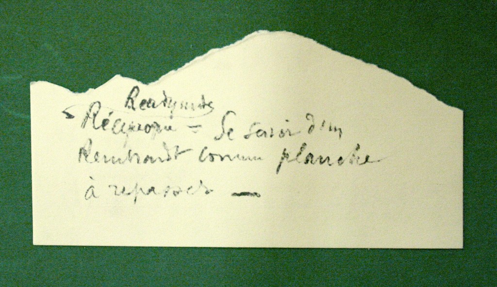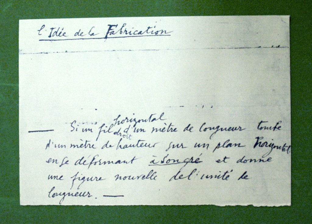 Le sens de cette citation est un peu différent de la précédente : du point de vue ici formulé par l’artiste, La Mariée mise en nue consisterait en la réunion du Grand Verre et de la Boîte verte, qui seraient comme les côtés pile et face d’une même pièce. Il apparaît en effet en déchiffrant le contenu de la boîte que, pour Marcel Duchamp, l’art n’est pas tant une somme d’artefacts achevés et autonomes qu’un processus y conduisant, une activité en déploiement. La Mariée, c’est donc l’œuvre que constitue matériellement le Grand Verre, mais c’est aussi l’ensemble des idées et des spéculations qui ont accompagné sa conception. Ceci confère avant l’heure une dimension conceptuelle au travail de Marcel Duchamp. D’ailleurs, si on ne peut réduire La Mariée à une idée clairement énonçable, une idée circonscrite qui présiderait à sa réalisation, on trouve en revanche dans la Boîte verte certaines notes qui, s’y on les appréhende de façon quelque peu anachronique au filtre de l’art conceptuel, résonnent comme des statements, des protocoles ou des programmes dignes de certaines expressions artistiques du tournant des années 1960 et 1970. Ainsi en va-t-il de la note livrant le principe du ready-made réciproque et de celle formulant le principe des 3 stoppages-étalon, deux projets qui semblent avoir pris corps au cours des recherches sur La Mariée :