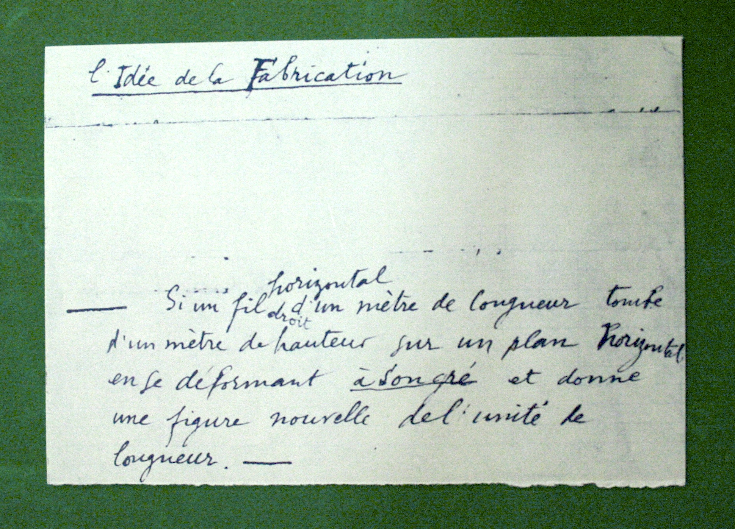 « Si un fil droit horizontal d’un mètre de longueur tombe d’un mètre de hauteur sur un plan horizontal en se déformant à son gré et donne une figure nouvelle de l’unité de longueur »19