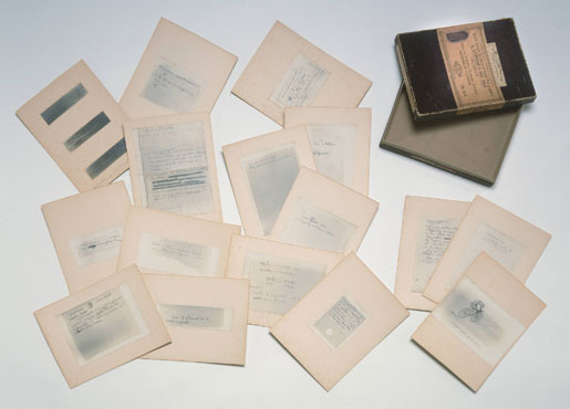 L’artiste a en effet produit tout au long de sa vie des boîtes en exemplaires multiples, contenant des notes relatives à son travail, des reproductions d’œuvres, des correspondances, des œuvres, aussi, parfois. Un rapide inventaire fait tout d’abord apparaître la Boîte de 19146, réalisée en cinq exemplaires seulement, en utilisant des boîtes cartonnées de plaques photographiques. Y sont réunies les reproductions de 16 notes manuscrites, contre-collées sur des feuilles de carton rigide. Les notes concernent le Grand Verre, débuté à cette période, et sont accompagnées d’une reproduction des 3 stoppages-étalon de 1913 et d’un dessin illustrant un poème de Jules Laforgue. Outre les cinq exemplaires, une sixième boîte regroupe les plaques de verre argentiques qui ont servi au tirage des photographies réunies dans les boîtes multiples.