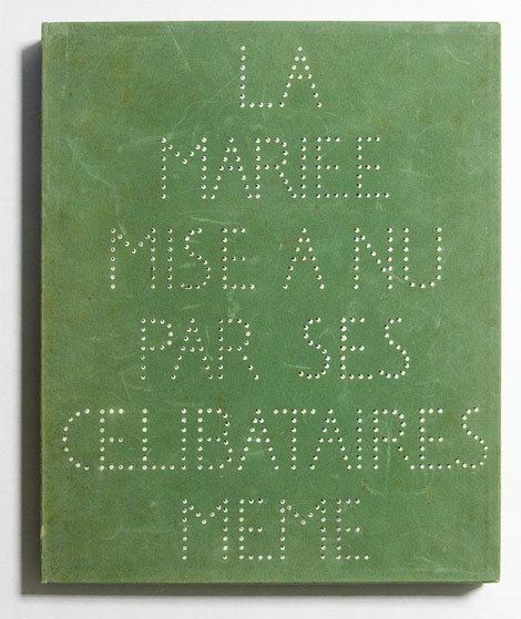 - Marcel Duchamp, La Mariée mise à nue par ses célibataires, même, ou La Boîte verte, 1934, auto-édité [édition Rrose Sélavy], 33,2 x 28 x 2,5 cm, boite en carton recouverte de suédine verte, titre inscrit en pointillé sur le couvercle pour l’édition courante de 300 exemplaires, titre poinçonné sur le couvercle avec initiale de l’artiste en cuivre sur le recto et le verso pour l’édition de luxe de 20 exemplaires, contient 93 fac-similés de notes manuscrites et d’œuvres ainsi qu’une reproduction couleurs. [↩]