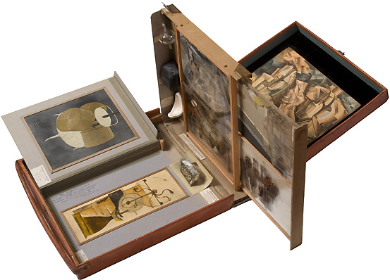 « Je veux faire […] un album d’à peu près toutes les choses que j’ai réalisées »20, dit Marcel Duchamp lorsqu’il formule l’idée qui va le mener à concevoir cette énième boîte. Celle-ci est un dispositif de conservation et d’exposition, sorte de musée portatif réunissant 69 items — reproductions d’œuvres ou miniatures — dans un objet qui tient tant du cabinet de curiosité que de la boîte à couture ou de la mallette de démonstration d’un camelot ou d’un voyageur de commerce.