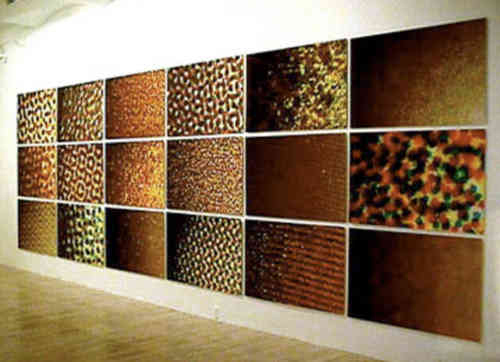 Simon Schaffer a organisé, avec Adam Lowe, une exposition à Cambridge en 2000, bien nommée N01SE, dans laquelle Adam Lowe montrait notamment Grey Cultured Cells (illustration 4) : une série de 18 agrandissements d’impressions réalisées avec des imprimantes Cmjn différentes, à partir du même fichier numérique de gris neutre. Évidemment, le résultat montre des différences sensibles. On est presque face à des œuvres différentes d’un genre de Gerhard Richter qui tenterait d’épuiser l’abstraction en passant d’un tachisme néo impressionniste, à un genre de dégradé de peinture radicale, à une méta pattern painting, puis à une sorte de pata Lichtenstein qui s’intéresserait à la trame dans une perspective abstraite ! Le circuit du numérique est évidemment, comme tout échange matériel de données, plein de bruits contingents, c’est-à -dire d’informations non intentionnelles : bruits à la captation, à la médiation, à la restitution qui viennent pas mal perturber la métrique et la maîtrise du bel ordonnancement numérique…