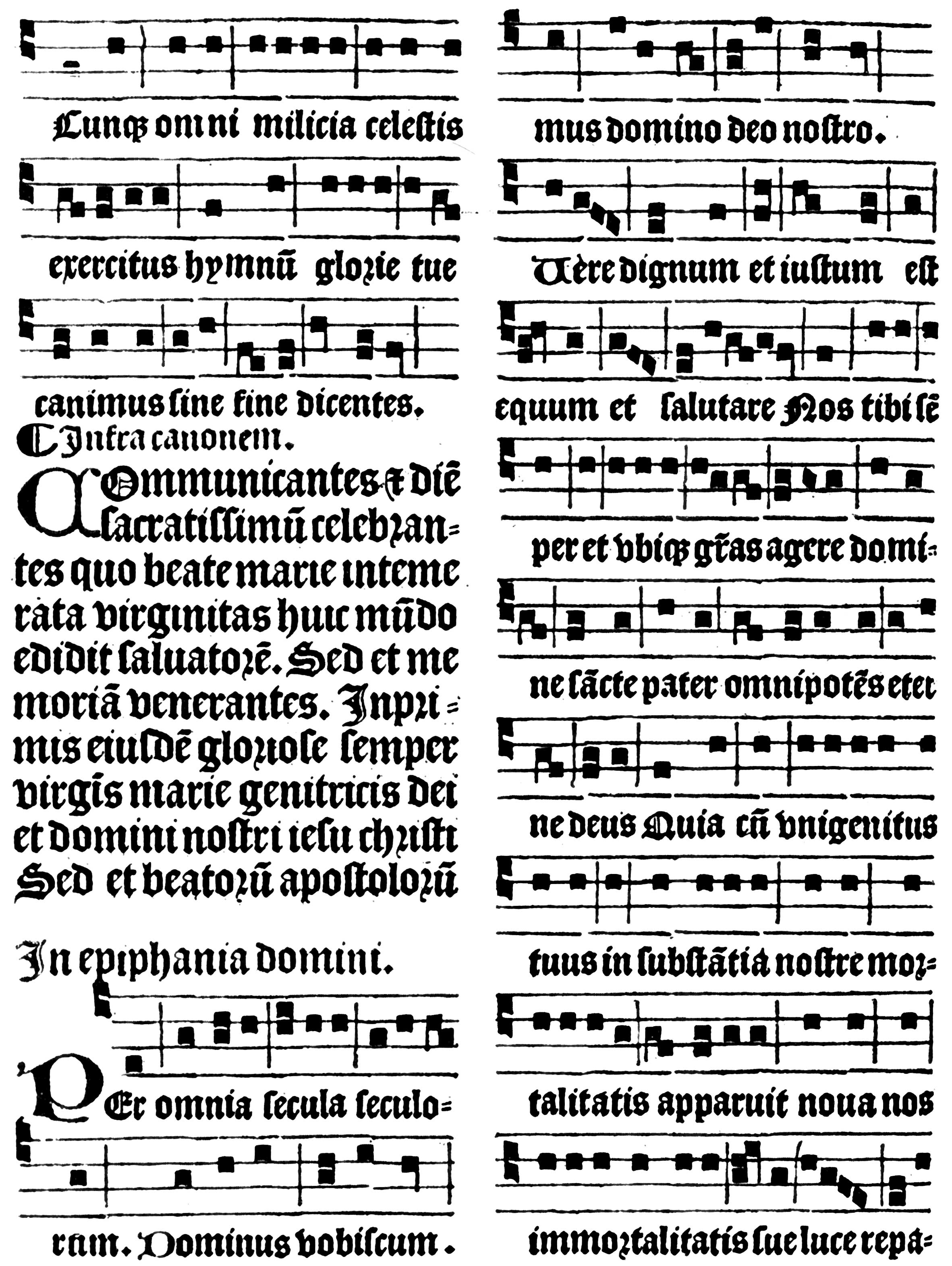 Les premières notes imprimées de la notation carrée dite « romaine » ( car employée pour le chant grégorien, liturgie officielle de l’Église catholique de rite romain ) de la fin du XVe siècle encrent beaucoup le papier.
