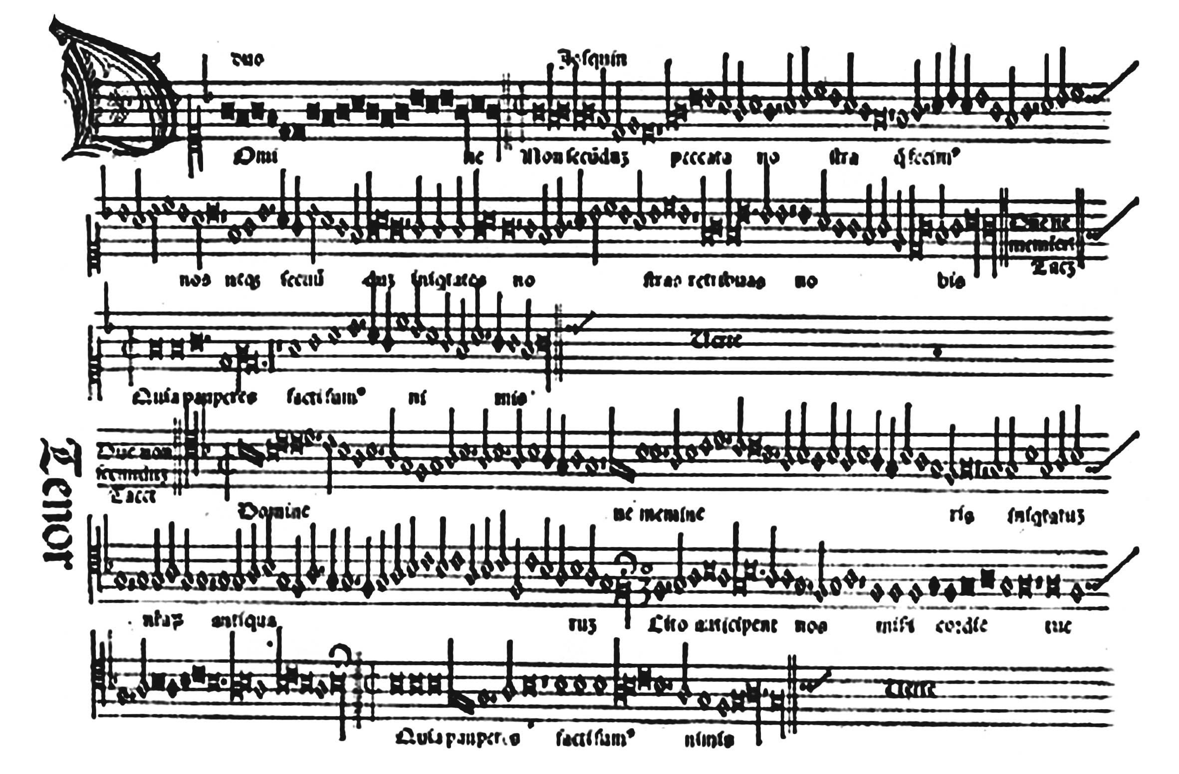 Au XVe siècle le papier remplace le parchemin. Les notes noires et compactes, dont l’encre traverse trop facilement la feuille, sont simplifiées par les imprimeurs pour devenir les losanges blancs. La première impression typographique complète de partition sans ajout manuscrit a lieu en 1501. Le typographe Ottaviano Petrucci (1466-1539) se sert de caractères mobiles en bois (dont il sculpte lui-même les signes) pour imprimer son Harmonice musices odhecaton: il imprime d’abord les lignes de portée puis le texte et les clefs et enfin les notes. Le parchemin est alors pressé contre les caractères encrés, à l’aide d’une presse.