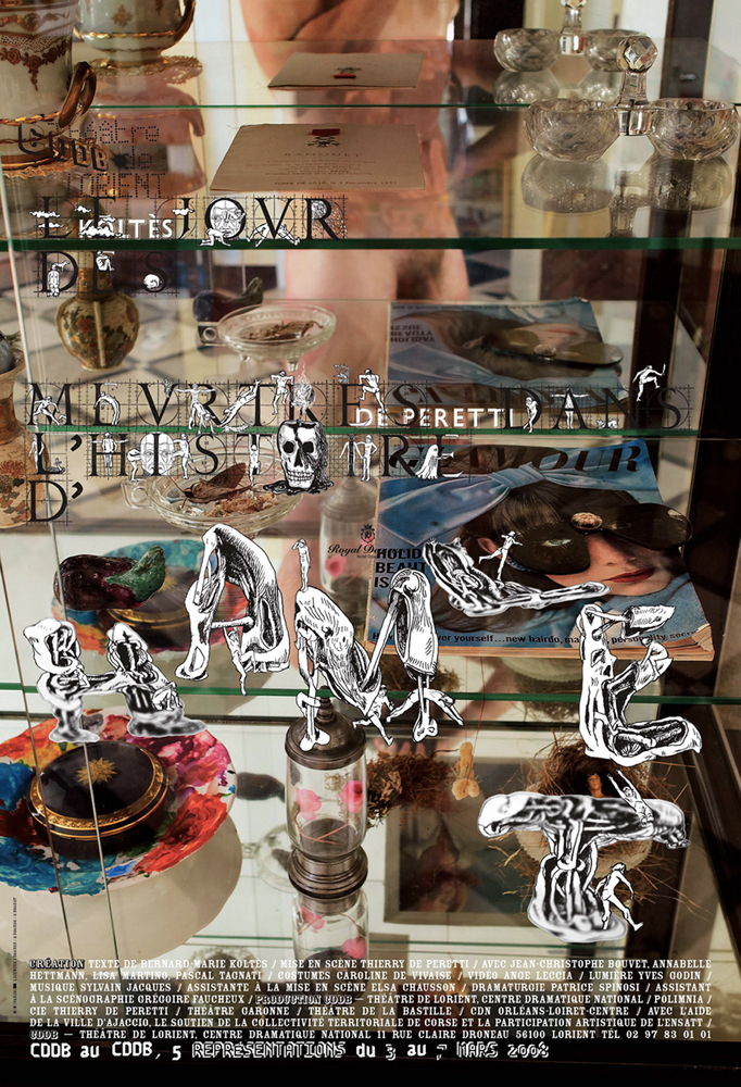 - Cf les affiches de m/m Paris pour le théùtre de Lorient, magnifiant lâambigĂŒitĂ© de lâimage, Ă la fois Ă©trangĂšre et fidĂšle Ă la piĂšce de théùtre en question. Elle font de lâillisibilitĂ© typographique â plus feinte que rĂ©elle â un gage libĂ©rant lâaffiche de la reprĂ©sentation de la piĂšce tout en lui confĂ©rant une singularitĂ©. Le Jour des meurtres dans lâhistoire dâHamlet emprisonne dans une vitrine un insecte aux ailes marrons, parmi les objets dâune collection privĂ©e rĂ©vĂ©lant par un demi-autoportrait, lâacte de consigner le temps et la confusion (de la collection des objets, des photos, des dessins, des souvenirs). PrĂ©cisĂ©ment, dans cette piĂšce, KoltĂšs interroge les reflets et les Ćuvres du passĂ© pour incarner les doutes du « faire histoire ». [↩]