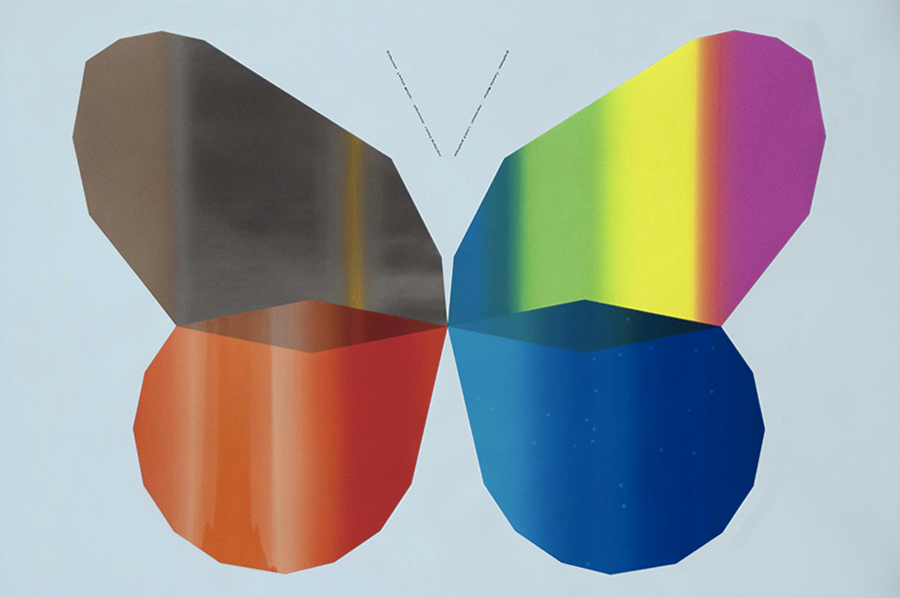 Dans Un Papillon, les couleurs, solaires, intenses, mais aussi translucides glissent, se mĂȘlent, se fondent. La matiĂšre Ă©caille des lĂ©pidoptĂšres se rĂ©vĂšle dans la suavitĂ© de la modulation des encres â elle a mĂ©langĂ© les litres d’encre directement sur l’Ă©cran de sĂ©rigraphie. LâopacitĂ© de la couleur se rĂ©vĂšle impossible, la graphiste la modĂšle comme un espace de projection. La couleur est passage, vers une autre couleur, vers le fond, et mĂȘme dans la partie dorĂ©e de son aile, les reflets de lâencre font que la surface appelle Ă la profondeur. Les encres sont jetĂ©es, manipulĂ©es, elles palpitent, une liquĂ©faction opĂšre35.