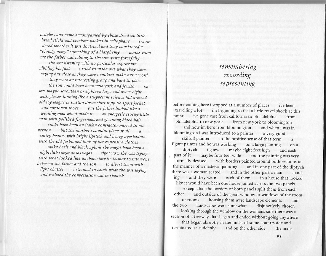 Qu’il s’agisse de l’énucléation distanciée de Descartes ou des situations d’observations chez Antin, la perception visuelle devient l’endroit d’une interrogation de représentations du sujet regardant et observant. Les descriptions et les récits d’observation sont pour Antin des moments où il s’observe regarder. Comme les récits biographiques et les expériences personnelles dont il parsème l’ensemble de ses poèmes parlés, ils passent par le filtre de leur narration en public. Les blancs de leur transcription typographique deviennent alors l’image rythmée de cette nouvelle couche. Non pas seulement la partition d’une lecture qui mimerait l’oralité, mais le lieu d’une représentation destinée au spectateur devenu lecteur.