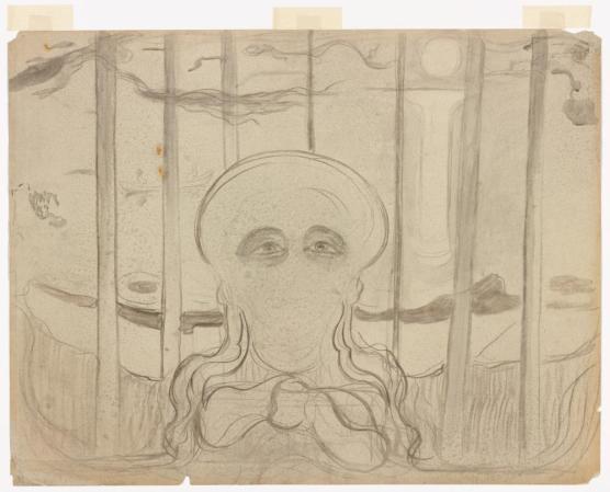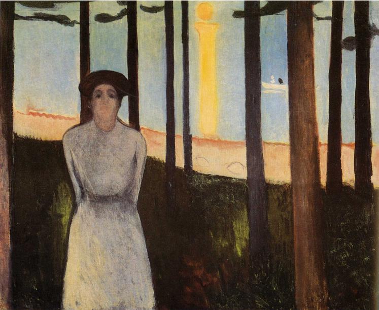 Un an plus tard, menant un peu plus loin mes recherches sur Antin et la présence inamovible du magnétophone dans son travail, je débute un cours sur l’histoire de l’enregistrement sonore et celle des techniques de reproduction de la voix. Pour illustrer un premier glissement entre invisibilité et visibilité des ondes sonores, je commence un de mes cours par la série de variations que le peintre Edvard Munch réalise au cours des années 1890 autour du motif de Songe d’une nuit d’été (La Voix). Ce qui m’intéressait, et ce malgré le titre qui se référait à William Shakespeare, c’était l’absence de bouche et l’omniprésence des yeux. Au fond de chacun des tableaux, gravures ou dessins, on trouve une sorte de « i » parfois inversé, formé par le soleil et son reflet sur l’eau. Une forme typographique apparaît pour signifier un objet naturel et son image projetée. Le sujet de la voix devient chez Munch celui de la lumière et de sa perception. Si le personnage féminin principal tourne le dos au soleil et fixe le spectateur, le regard de ce dernier finit immanquablement par se poser sur le soleil couchant. Je retrouve un même point aveuglant dans Le Soleil de 1909. Cette fois le sujet n’est pas seulement le reflet, mais aussi l’explosion du spectre lumineux. Cette lumière résonne avec celle brûlante du Getty.