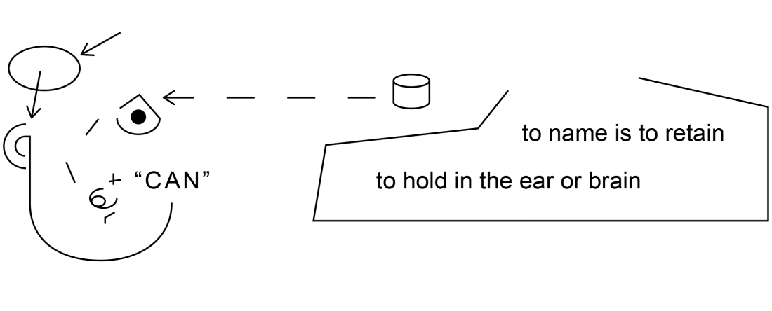 Comme s’il cherchait à vérifier les spéculations poétiques de Zukofsky, Antin trace sous cette citation le dessin du processus de vision esquissé dans le texte. Une flèche qui part d’une boîte de conserve pointe vers un œil schématisé. Dessous, on peut lire, relié par deux courts traits, le mot « CAN ». Sur la gauche, un peu au-dessus de l’œil, Antin a tracé un cercle relié à une oreille, elle aussi associée au même mot « CAN ». Juste devant ce mot se trouve un autre cercle, ouvert cette fois, qui semble représenter une bouche. Antin accompagne son schéma d’une note encadrée : « nommer c’est retenir / garder dans l’oreille ou le cerveau ». Il illustre ainsi les différentes interactions entre le cerveau (le cercle), l’œil et l’oreille (les deux schématisations), la bouche (le signe indéfini) et la chose vue (« CAN »), points cardinaux entre lesquels, selon Zukofsky, naviguent les opérations de lecture, d’écoute, d’intellectualisation et d’énonciation. Ce faisant, il rabat la dimension poétique dans le domaine ordinaire – « les faits physiologiques de l’amour » sont des fonctions qui ne concernent plus l’écriture mais une simple boîte de conserve.