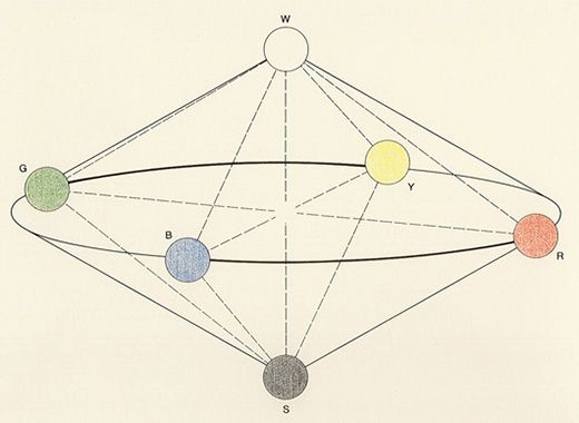 Aloïs Hofler, « Système des couleurs », basé sur le schéma publié page 216 de Grundlehren der Logik un Psychologie, Leipzig-Vienne, Freytag-Tempsky, 1906.