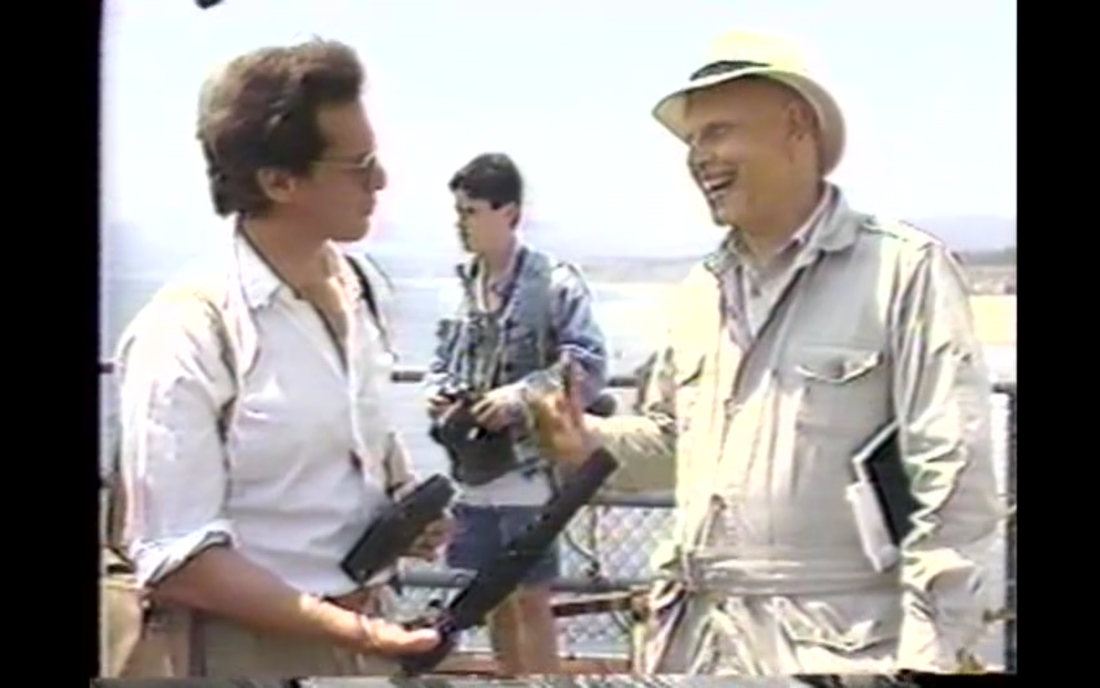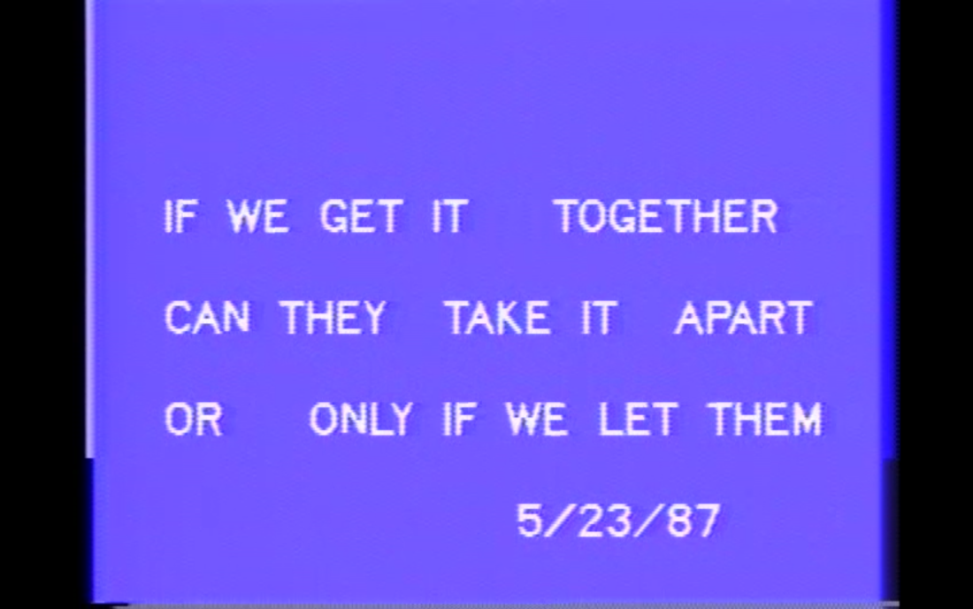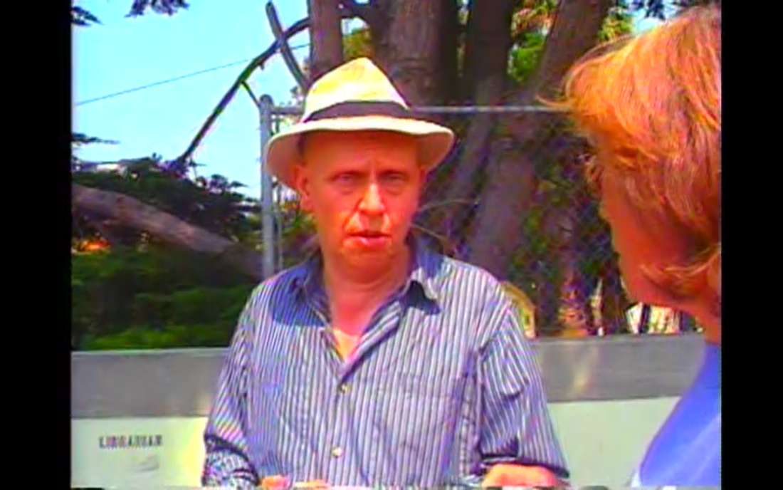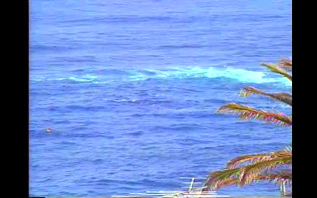 La première image de David Antin que j’ai vue était une vidéo sur Youtube. Quelqu’un avait uploadé une captation du déploiement de ses Sky Poems à Santa Barbara en 1987. On le voyait interviewé avec une veste et un chapeau blancs commentant les poèmes qui s’inscrivaient dans le ciel. La traduction de la lumière sur la bande, puis de la bande vers la plateforme numérique a rendu le ciel bleu électrique. L’image vibre et tire franchement sur le blanc lorsque la caméra se tourne vers le soleil et que le transfert sur bande ne permet plus d’accepter autant d’information lumineuse. Elle devient réellement surexposée et permet à peine de voir la vapeur d’eau blanche tracer les lettres sur le fond bleu du ciel. Par souci de transposition documentaire, le ciel devient un monochrome violet lorsqu’apparaît une version numérique en fin de bande. Dans une autre vidéo tournée à l’occasion de la seconde édition des Sky poems en 1988, les couleurs de l’image sont saturées. Le ciel et la mer sont d’un violet profond, les blancs sont oranges, la peau d’Antin est rouge et le vert des pelouses et des palmiers est entièrement irréel. Le passage par les différents transferts illustre la valence de la représentation des signes du monde naturel.