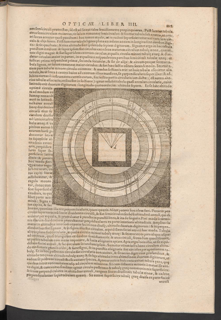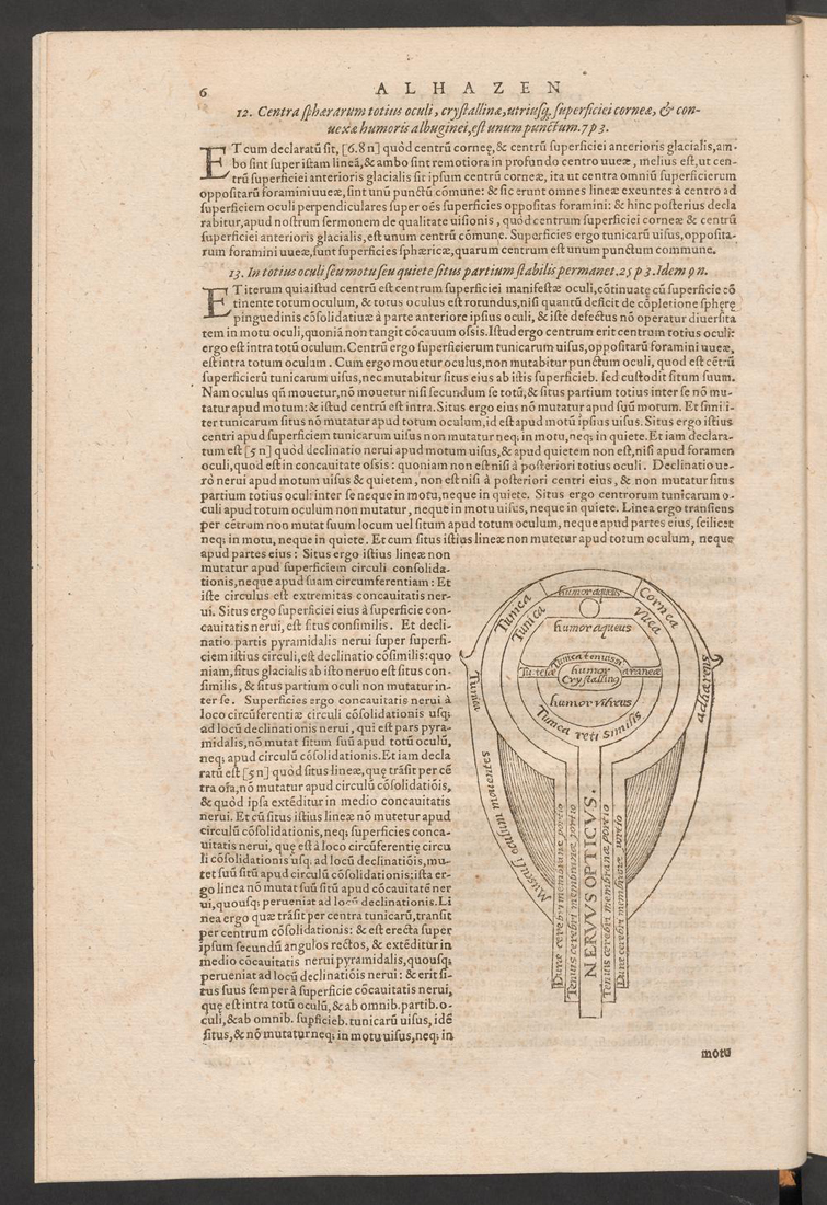 Dans son poème parlé « mémoriser enregistrer représenter », David Antin décrit la représentation extrêmement schématique d’un œil qui illustre le Traité d’optique d’Alhazen, écrit entre 1015 et 1021 – ici sa version latine typographiée de 1572. Il compare sa description à une camera osbcura. Plus loin, Alhazen aplatit l’œil comme si un anatomiste avait cherché à transformer un écorché en tableau abstrait et géométrique. Dans Le Dioptrique, René Descartes revient sur l’optique d’Alhazen et montre à son tour à plusieurs reprises un œil géométrisé accompagné cette fois d’un homme barbu qui en observe le fonctionnement.