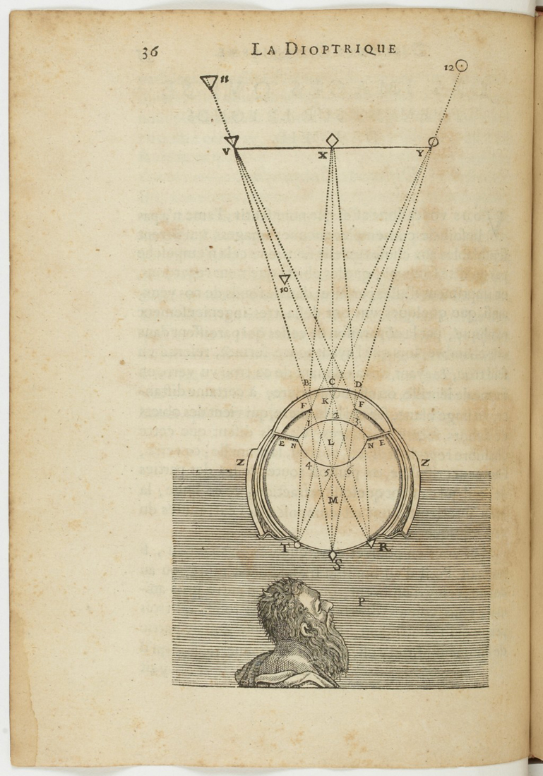 René Descartes, « Des images qui se forment sur le fonds de l’œil », La Dioptrique, in Discours de la méthode pour bien conduire sa raison et chercher la vérité dans les sciences, plus la Dioptrique, les Météores et la Géométrie qui sont des essais de cette méthode, Leyde, Imp. Ian Maire, 1637, p. 36 © Bnf