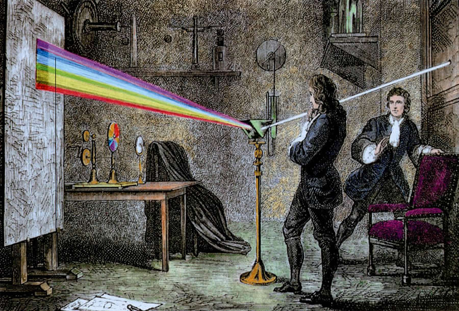 Chemin faisant, autorisons-nous un bond dans lâespace et le temps. Quittons les lumineux rivages de la MĂ©diterranĂ©e, pour les brumes de lâAngleterre de la fin du 17e siĂšcle. Le mot spectre sera dĂšs lors dĂ©finitivement rattachĂ© Ă celui de la lumiĂšre grĂące Ă Isaac Newton. Dans cette pĂ©riode de chevauchement entre la fin dâun siĂšcle et le dĂ©but dâun autre qui sera connu comme celui des LumiĂšres, Newton travaille sur cette dite lumiĂšre et essaie dâen comprendre la nature. Câest en 1666 quâil rĂ©alise lâexpĂ©rience dans laquelle il dĂ©compose la lumiĂšre dite blanche grĂące Ă un prisme et dĂ©montre que cette « pleine » lumiĂšre est composĂ©e de lumiĂšres colorĂ©es. Par lĂ il dĂ©montre que la couleur ne naĂźt pas des objets mais bien de la lumiĂšre. Pour dĂ©crire la forme de la lumiĂšre dĂ©composĂ©e qui lui apparait, il utilise le mot de spectre car les contours de cette formes sont flous, et câest lĂ une des caractĂ©ristiques du spectre, en mĂȘme temps que de poser, en tant quâapparition, des problĂšmes de nature optique. Ce spectre devenu scientifique, est capable, en dĂ©composant la lumiĂšre blanche, de faire apparaitre ce qui ne devrait pas ĂȘtre visible, de nous montrer ce qui est cachĂ©. Cette dĂ©composition de la lumiĂšre est une altĂ©ration du rĂ©el, une perturbation, une rĂ©vĂ©lation. Elle nous montre, et nous permet dâaccĂ©der une autre rĂ©alitĂ©.