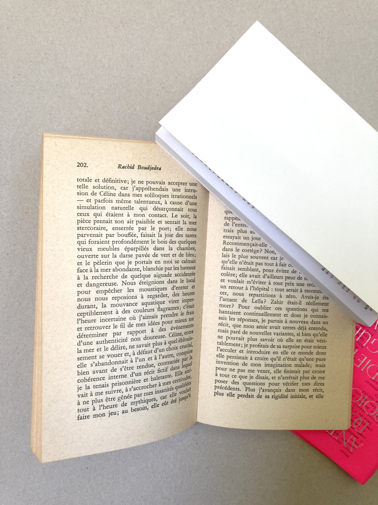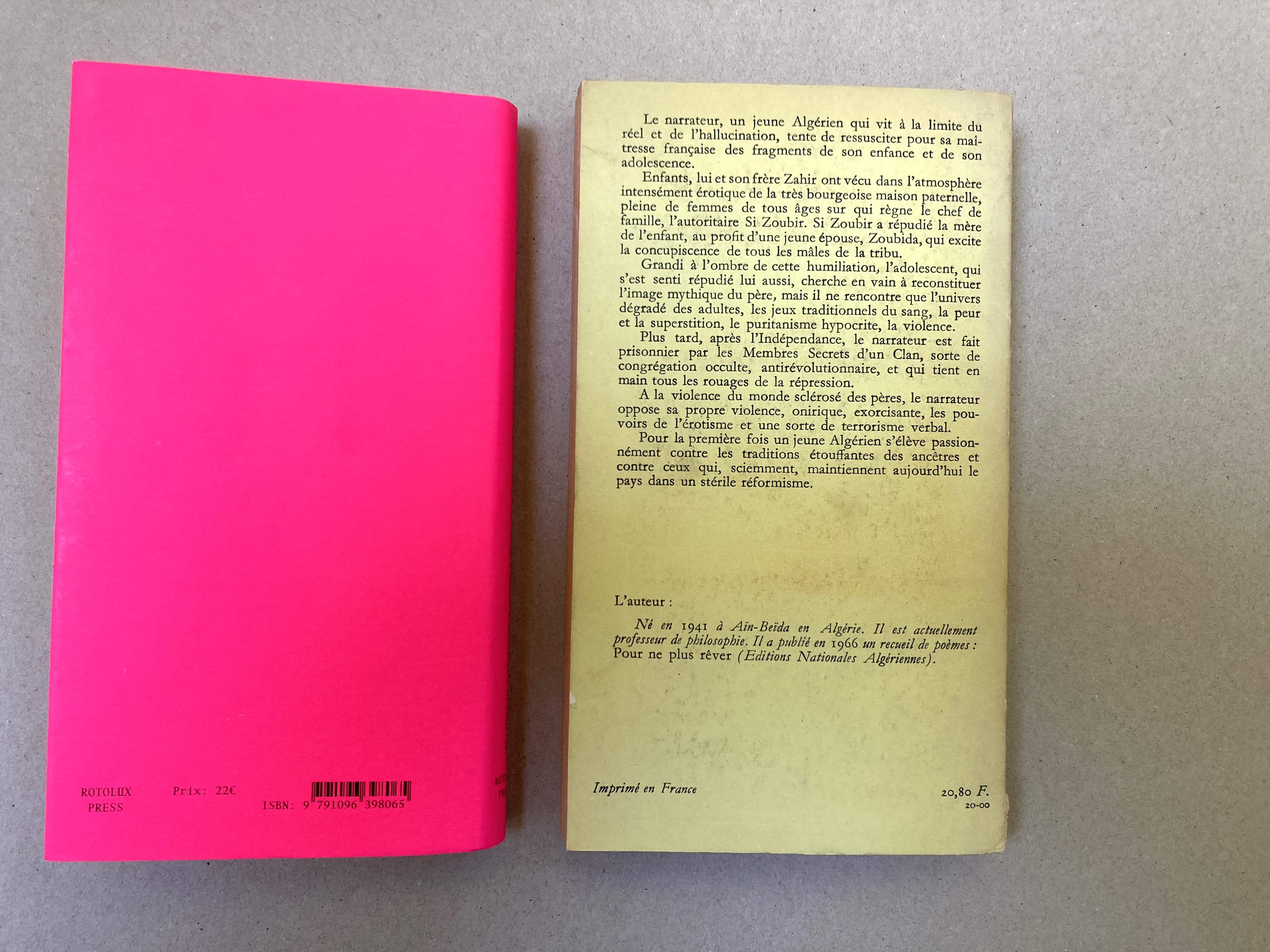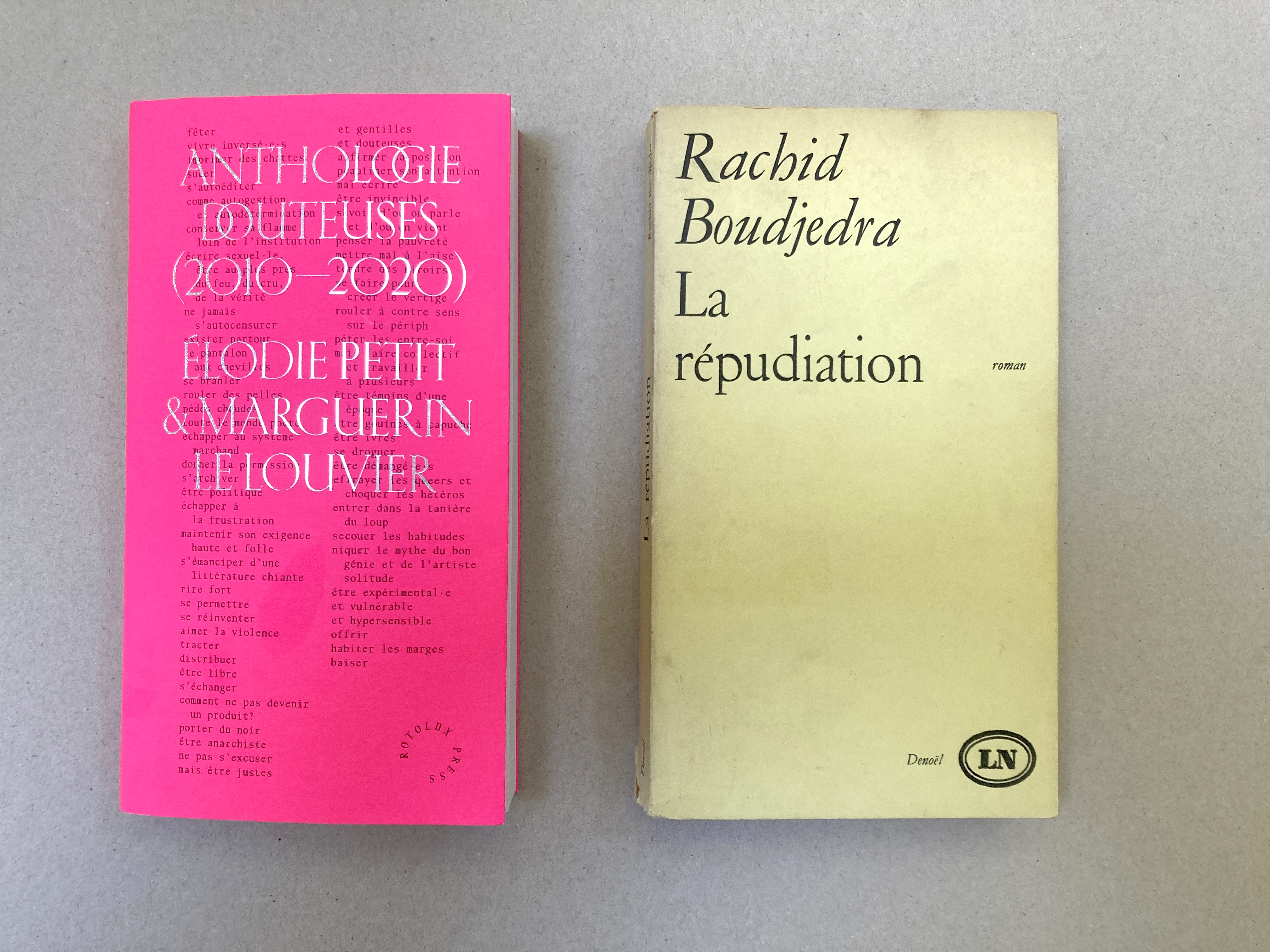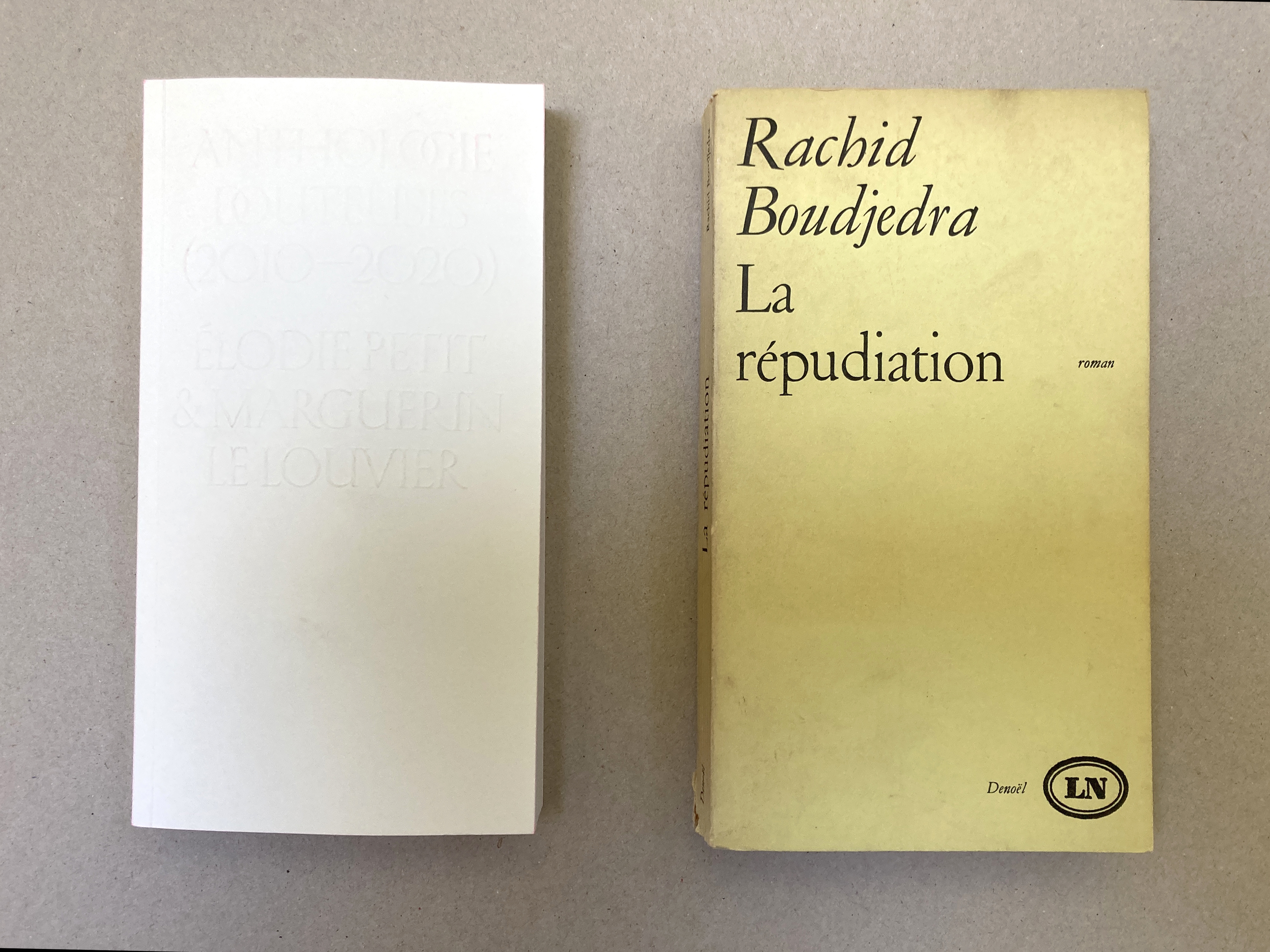 de gauche à droite : Élodie Petit & Marguerin Le Louvier, Anthologies douteuses, Paris, Rotolux Press, 2021 ET Rachid Boudjedra, La Répudiation, Paris, « Lettres nouvelles », Denoël, 1969.