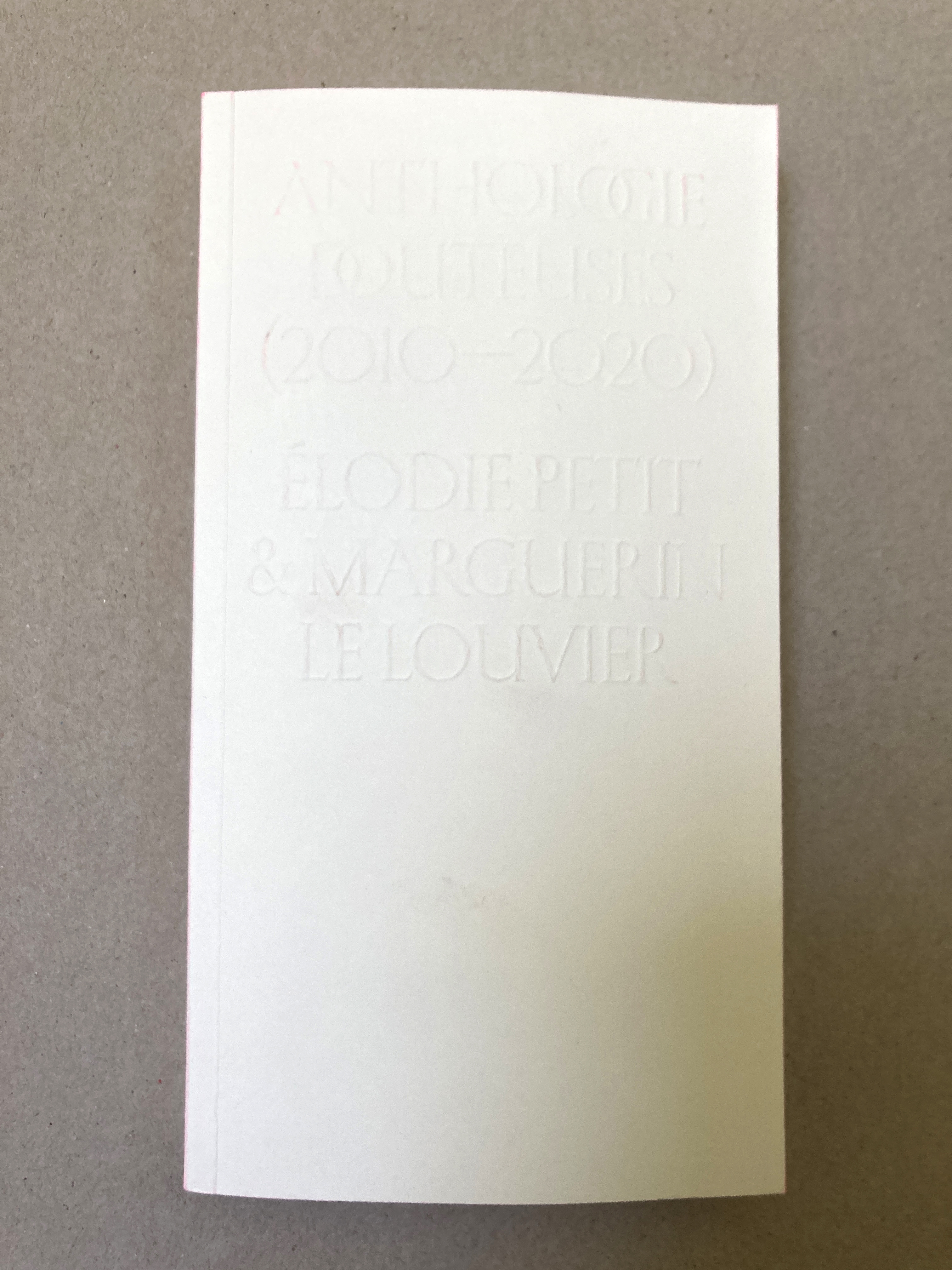 1969. Le prénom et le nom de l’auteur se lisent en premier, et en italiques. 2021, Élodie Petit & Marguerin Le Louvier soutiennent crânement l’Anthologie douteuses, au singulier plurielles et en première place. Singulière orthographe, pas banale. Les marges explosives et au taquet des mots, disent ici que de règles il n’en existe que pour les contredire, les répudier, s’asseoir dessus et provoquer les habitudes qui enterrent.