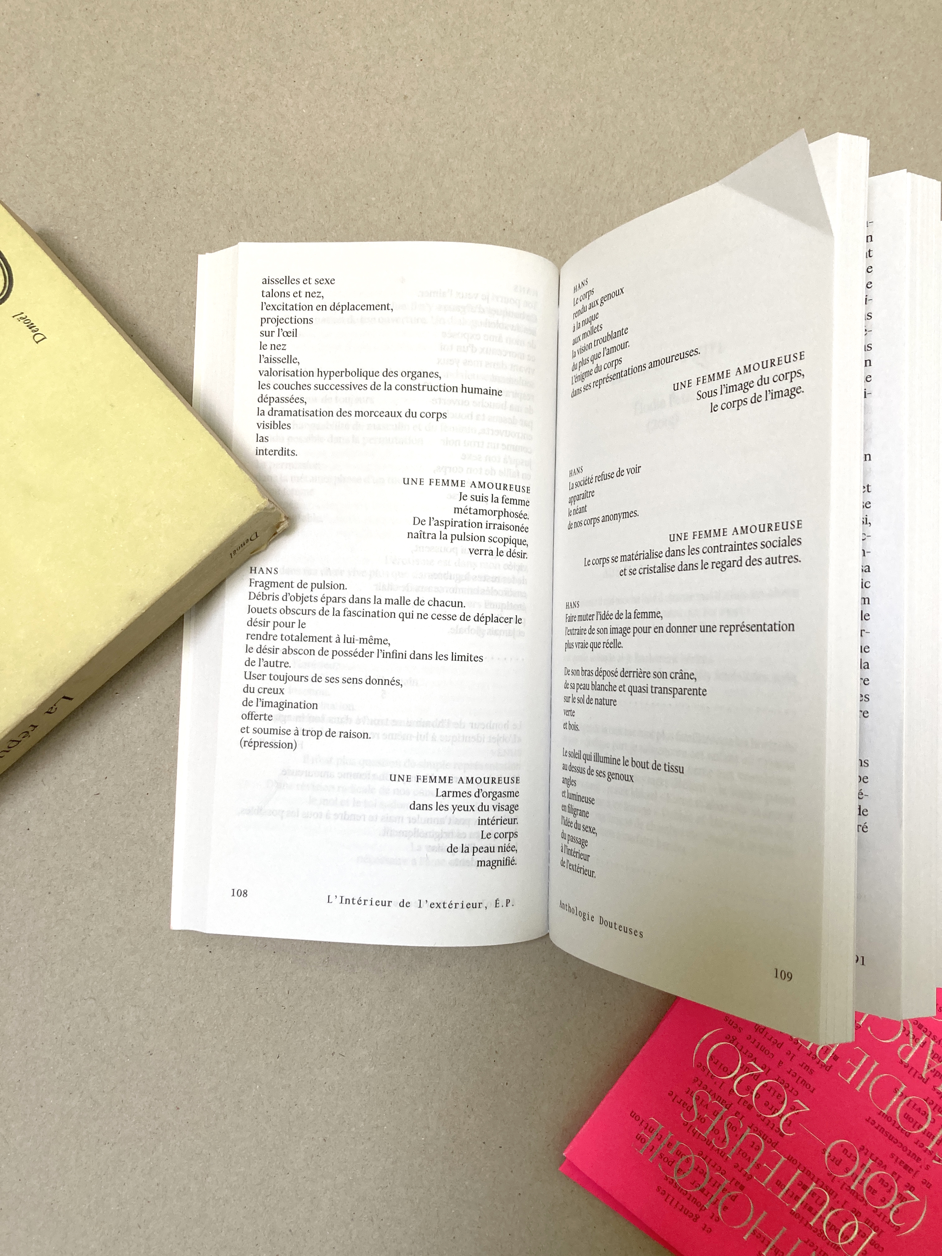 Parlons-en justement. La lecture peut se faire orgasme. Toujours solitaire. Dans les pages tendues au cordeau de l’Anthologie douteuses, le sublime texte d’Élodie Petit — Intérieur de l’extérieur. D’après Ouvrir Vénus, Georges Didi-Huberman ; Petite anatomie de l’image, Hans Bellmer ; Des poupées et des hommes, enquête sur l’amour artificiel, Elisabeth Alexandre et Helena Dorfman — fait s’élever des sortes d’aphorismes anti-romantiques. Une femme amoureuse clame, page 108, « Je suis la femme / métamorphosée. / De l’aspiration irraisonnée / naîtra la pulsion scopique, / verra le désir. »